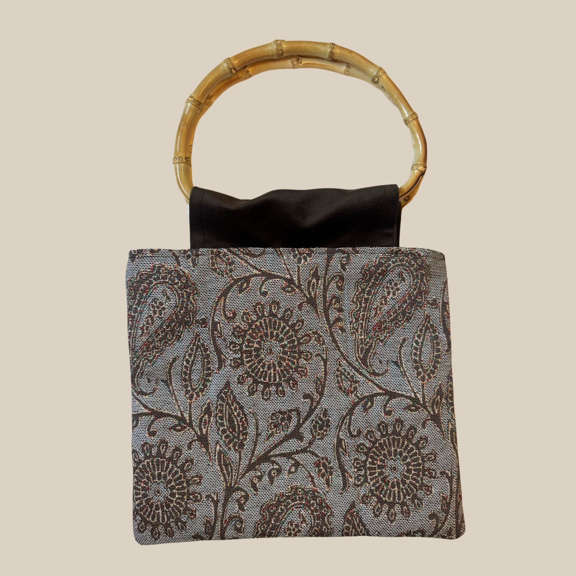 Bolso Laguna hecho a mano con asa de bambú y tela estampada. Perfecto para ocasiones especiales, bodas,..